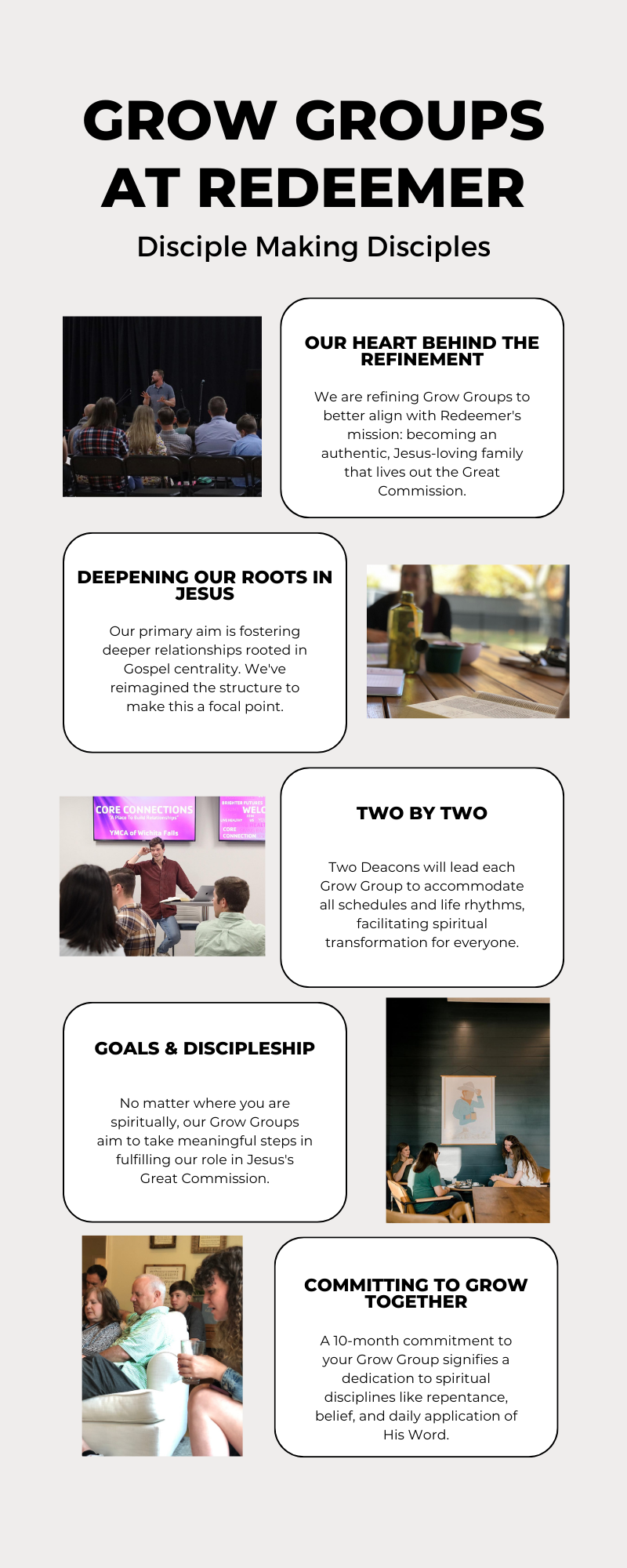 I know we all earnestly desire for Redeemer to grow into a Gospel-Centered Disciple Making Family. The refinements to our Grow Groups aren't merely structural but are deeply purposeful to serve our body to live out our values faithfully. We will always sharpen our focus to better align our Grow Groups with the heart of Redeemer Church: all of Christ for all of life.